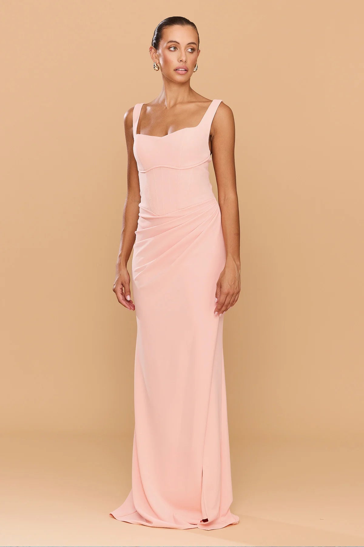 Step into elegance with the Elena Gown designed to sculpt and accentuate the female form. The full-length gown exudes timeless sophistication, featuring a structured bodice with a 90's inspired square neckline and a curved under bust pipping detail. The draping cascades gracefully along the waist, leading to a cross over split that can be worn either closed or open. Made from our premium stretch bonded crepe fabric, the Elena Gown combines comfort with style.