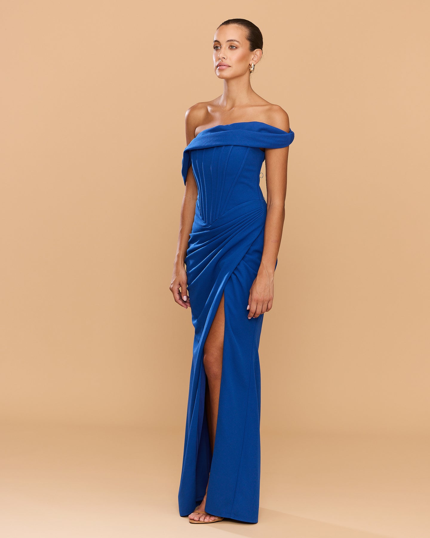 Elevate your formal look with the Sapphire gown in striking cobalt blue. Featuring a flattering corset detail and a elegantly draped skirt, this off-shoulder design highlights your silhouette with timeless sophistication. Perfect for school balls, weddings, or any special occasion, this gown combines classic style with modern charm to ensure you stand out effortlessly.