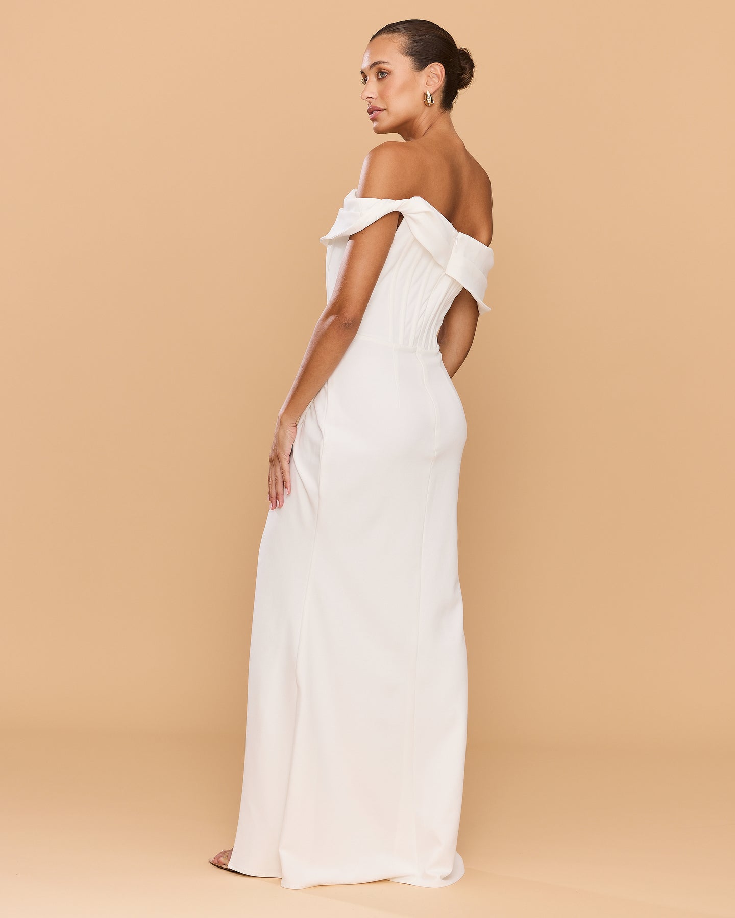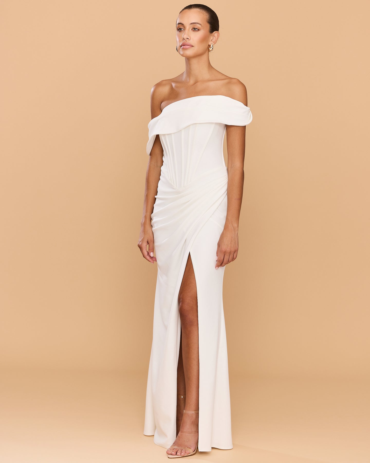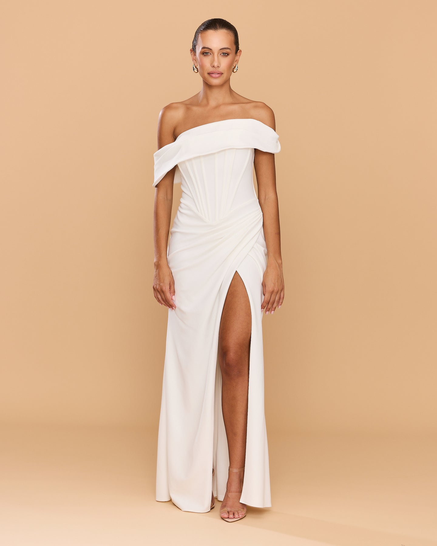 The Sapphire gown in white features an elegant off-shoulder design paired with a flattering corset detail that enhances your silhouette. Ideal for bridal showers, hens nights, or glamorous galas, this gown combines timeless style with a touch of sophistication to make you stand out on any special occasion.